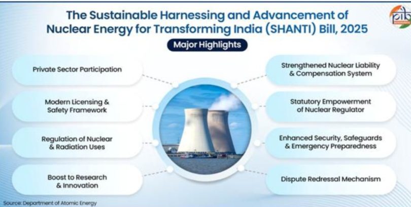 भारत के बदलाव हेतु परमाणु ऊर्जा के सतत दोहन और विकास (शांति) विधेयक, 2025, यह विधेयक भारत की परमाणु ऊर्जा यात्रा के अगले चरण को आकार देने में एक महत्वपूर्ण कदम है। कानूनी ढांचे का आधुनिकीकरण और संस्थागत निगरानी को मजबूत करके, यह अधिक कुशल, नवोन्मेषी और सुरक्षित परमाणु ऊर्जा इको-सिस्टम की नींव रखता है। यह विधेयक स्वच्छ और विश्वसनीय ऊर्जा के विस्तार के भारत के दीर्घकालिक दृष्टिकोण का समर्थन करता है, साथ ही यह सुनिश्चित करता है कि रणनीतिक हित पूरी तरह से सुरक्षित रहें। जैसे-जैसे देश ऊर्जा के क्षेत्र में आत्मनिर्भरता और तकनीकी उन्नति की ओर आगे बढ़ रहा है, यह कानून भारत की परमाणु ऊर्जा और व्यापक ऊर्जा परिदृश्य के विकास को गति देने में निर्णायक भूमिका निभा सकता है।
