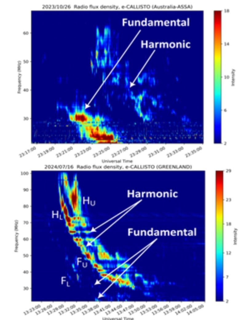 चित्र : ऊपर: 26/10/2023 को टाइप II का विस्फोट, जिसमें मौलिक ध्वनि हार्मोनिक ध्वनि से अधिक मजबूत है, और नीचे: 16/7/2024 को एक विस्फोट, जिसमें इसका विपरीत देखा जा सकता है।